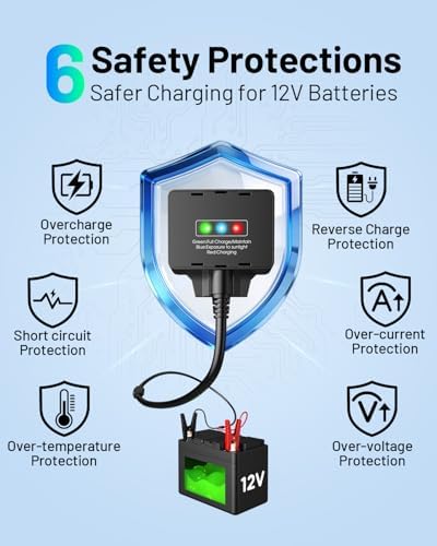 Visual Feedback & Active Protection: Monitor your charging status at a glance with the intuitive 3-color LED system: Blue for sunlight detection, Red for active charging, and Green for “Maintenance Mode.” Leave connected 24/7 without worry thanks to our 6-Point Smart Safety system, which safeguards against reverse charging and overvoltage, significantly extending battery lifespan.