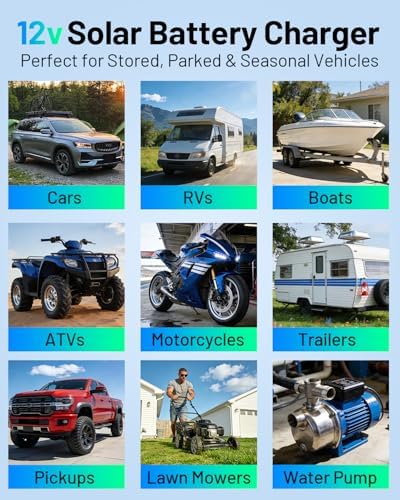 Universal Vehicle Compatibility: Say goodbye to dead batteries during storage. Designed for cars, motorcycles, boats, trucks, pickup and RVs, this 12V solar battery maintainer seamlessly supports LiFePO4, AGM, and GEL batteries—perfect for keeping your seasonal vehicles power-ready during winter breaks or long-term parking.