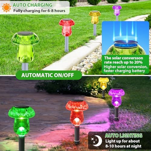 ?Higher Conversion Rate Solar Panels?Benany solar mushroom lights for outside use high conversion solar panels and contains 1.2V 250 mAh AAA rechargeable Battery, you can enjoy efficient charging speed. The solar garden lights automatically charge during the day, over a period of 6-8 hours. And they turn on automatically at night, providing at 8-10 Hours of lighting. Solar charging can save you electricity costs and be used with confidence throughout the year. Perfect landscape lighting and garden decor.