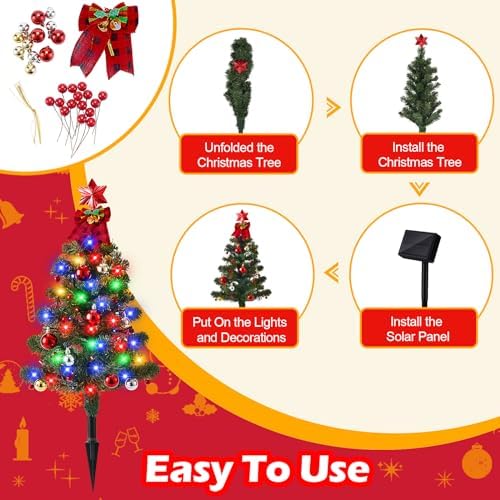 Brighter & More Interesting – Our solar-powered outdoor Christmas tree will be the highlight of your Christmas party, boasting 68 LED bulbs, nearly double the number found in other lights on the market. Featuring red, yellow, blue, and green lights, it adds a colorful Christmas ambiance. Unlike standard single-function lights, our solar Christmas tree offers 8 modes for you to choose from, promising more fun for your family!
