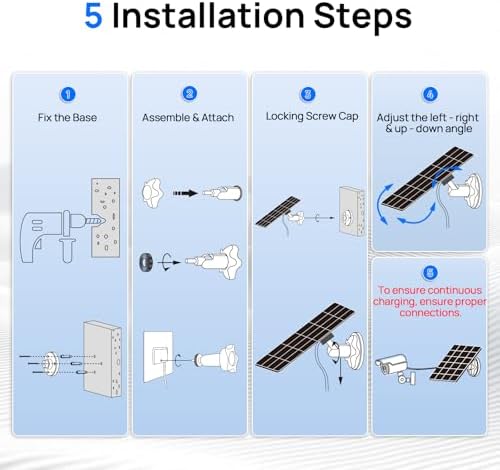?5-Step Setup in 90 Seconds?This solar charger comes with a 360°+90° adjustable mounting bracket for easy optimization of the angle of sunlight exposure. We provide professional instructions, video installation guides, and technical support to make everything simple.The 9.8ft extension cable meets placement requirements while ensuring minimal power loss, and also conceals the camera for enhanced security.