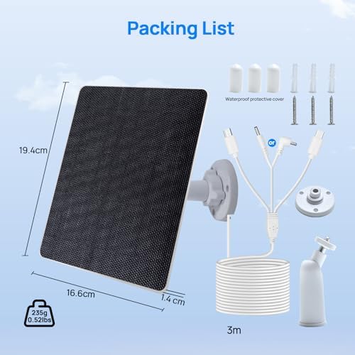 ?Built to Endure?The outdoor camera solar panel features an IP65 waterproof design, allowing it to withstand harsh weather conditions such as blizzards and heavy rain. The ETFE material boasts excellent weather resistance and anti-aging properties, making it highly environmentally friendly and suitable for outdoor use. The 1-to-3 plug design offers superior waterproofing and durability compared to traditional adapter designs.