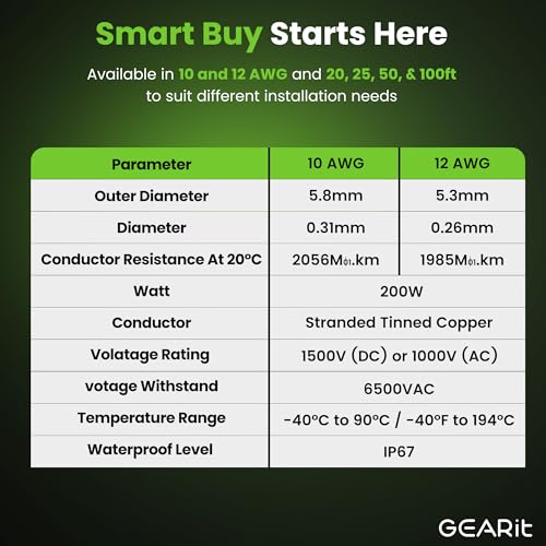 Multiple Options Available: Choose from various wire gauge sizes (10, 12 AWG) and length options (20ft, 25ft, 50ft, 100ft) to fit your specific solar panel system needs.