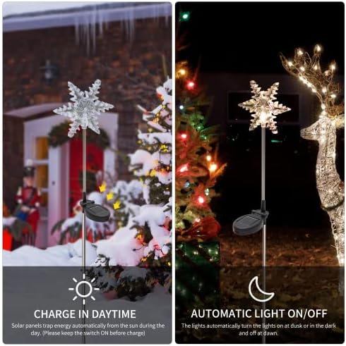 4 PACK SOLAR CHRISTMAS SNOWFLAKE LIGHTS: Our 4 pack delicate solar Xmas garden lights with vivid clear snowflake embellishes your garden, Christmas solar decorative lighting ensures a great effect when the lamp glows warm lights in the dark. Measures: approx. 5.5 x 4.3 x 31.1 inches per lights