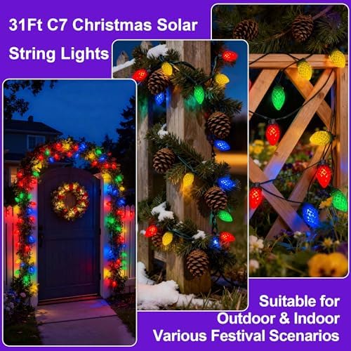 ITICdecor Solar String Christmas Lights C7 31ft 50 LED Colourful Strawberry Hanging Lights Outdoor Waterproof Green Wire Fairy Light Decoration for Garden Patio Yard Camping Party Gifts for Dad Mom