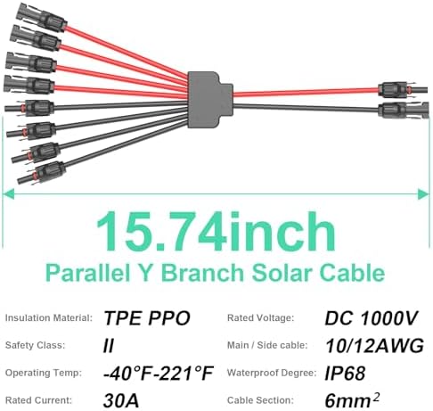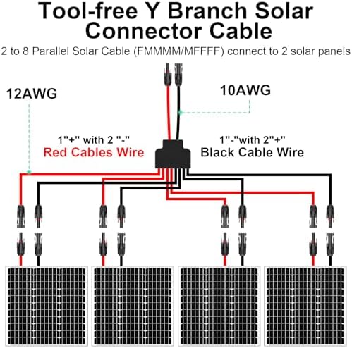 ?Parallel Y Solar Cable Connector?Red line: 1 male to 4 female (M/FFFF) and black line: 1 female to 4 male (F/MMMM) solar connectors, allowing you to connect 4 solar panels in parallel. With our upgraded design, it’s easier to connect and organize.