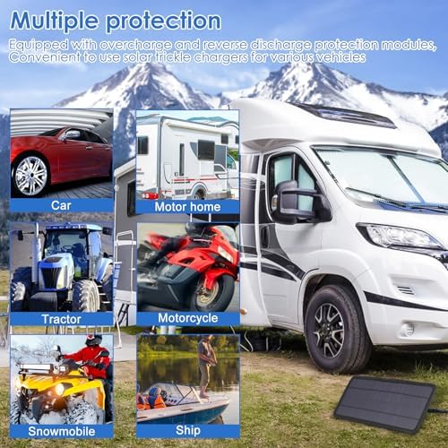 Wide Application: This solar trickle charger is widely used for various vehicles, RVs, campers, tractors, motorcycles, snowmobiles, boats, and more