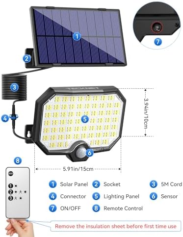 Price: $34.99(as of – Details) Product description TECKNET 3600LM 252LEDs Solar Motion Lights with 16.4ft Cable 1 Always On Mode 2 Dim Light Sensor Mode 3 Strong Light Sensor Mode Yard Front Door Garage Product Dimensions ? : ? 5.5 x 3.9 x 11.8 inches; 2.23 Pounds Item model number ? : ? TK-SL004 Date