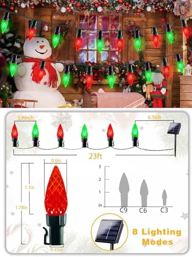 Price: $16.99(as of – Details) C6 Solar Christmas Lights Outdoor, 50 LED 16FT Christmas Decorations Outdoor Waterproof, Solar String Lights for Outside with 8 Modes, Fairy Twinkle Light for Tree Garden Xmas Decor (Red and Green) C6 Red and Green Christmas Lights: 16FT plus 6.56ft lead wire, total 22.56FT string lights, space between LEDs: 3.9