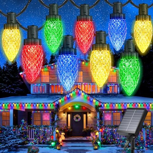 iBaycon Solar C9 Christmas Lights Outdoor, 65FT 100LED C9 Strawberry String Light, 8 Modes Solar Powered Lights String for Xmas Tree House Eaves Roof Christmas Holiday Decorations