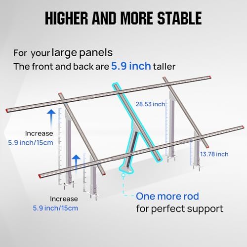 [Strong Adaptability] ECO-WORTHY Mounting Bracket is 118″Lx39″W In. the front and rear pillars are 5.9 in higher, the front column is 13.78 in, and the rear column is 28.53 in,Which can better support large Solar Panels.Suitable for home, farms, cabin and off-grid