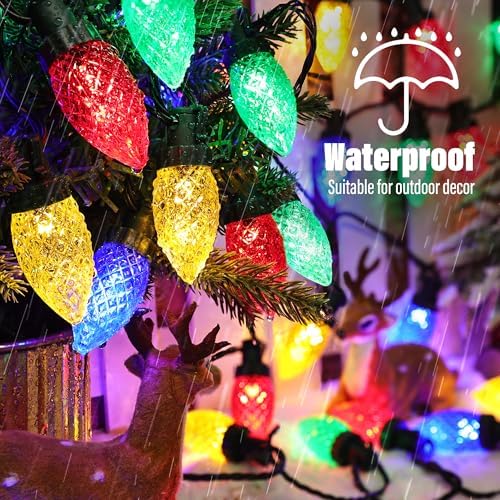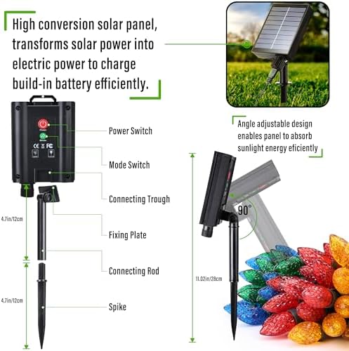 Solar Powered and Auto ON/OFF: These C9 Christmas lights feature a high-efficiency solar panel and a rechargeable battery. Charge for 6-8 hours during the day and work for 8-10 hours at night. The built-in light sensor auto turns the lights on at dusk and off at dawn